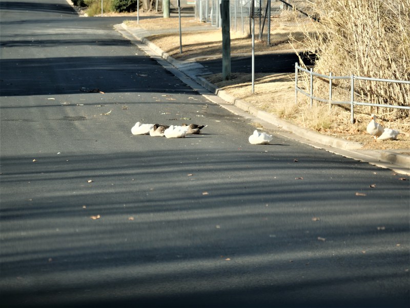 Some geese try to get warm on the road.