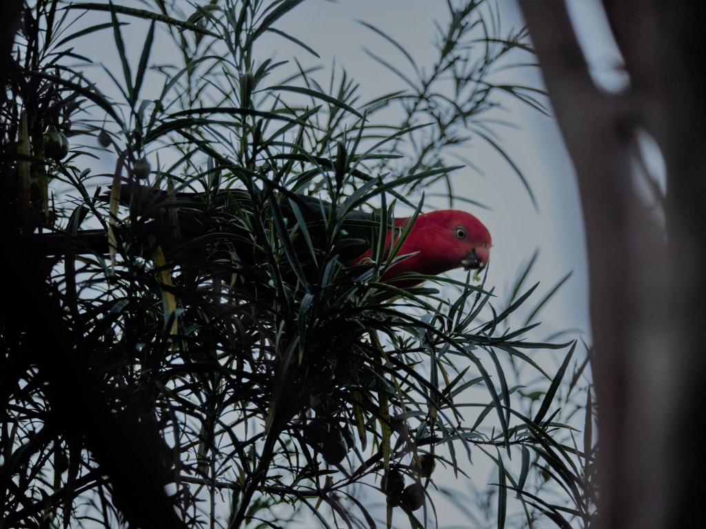 A King Parrot visited for some tucker. I am not sure whether the plant is Solanum laciniatum or Solanum aviculare. It is a favourite among the birds and also the rodents. I understand that First Nation’s people use the fruit of Solanum (aka kangaroo apple) to make a poultice for swollen joints, as the fruit contains a steroid used in the production of cortisone. Now, that has got me thinking ….