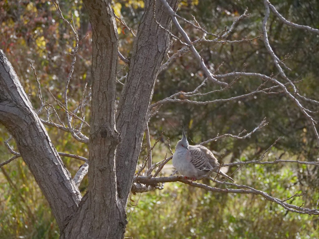 I barely managed to pick up the camera but spurred on by my supporters, the crested pigeons, I began. Fluffed up, a crested pigeon warms up in a pocket of sun.