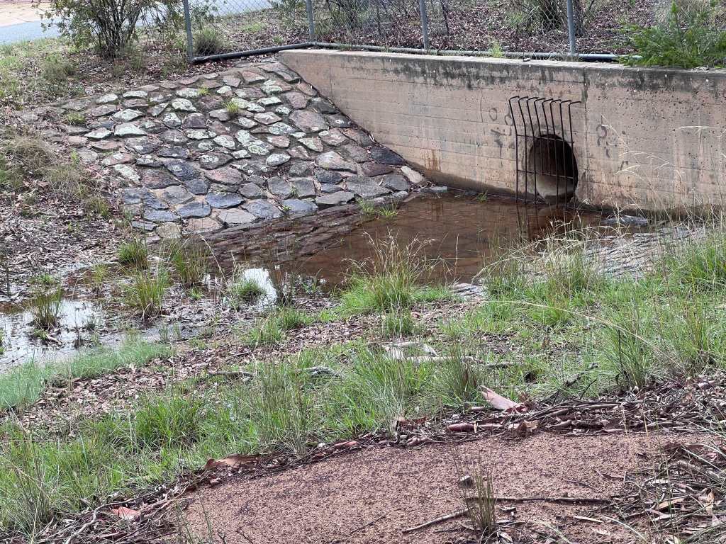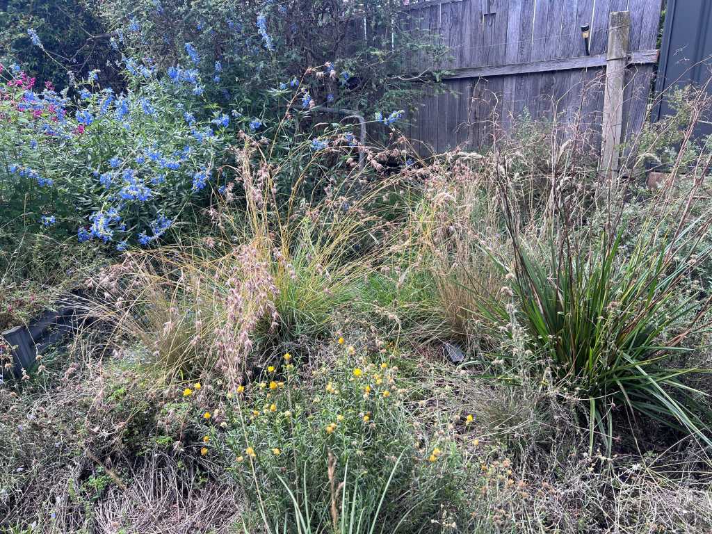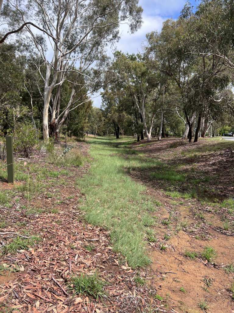The next drain photo is from another angle. We’ve woman-handled the ALG, the festuca, goose grass and paspalum from this once rampantly weedy area. My True Love helps but he still has a big to-do list that he is working his way through. The reeds and native grasses are doing their job too, filtering the run-off.