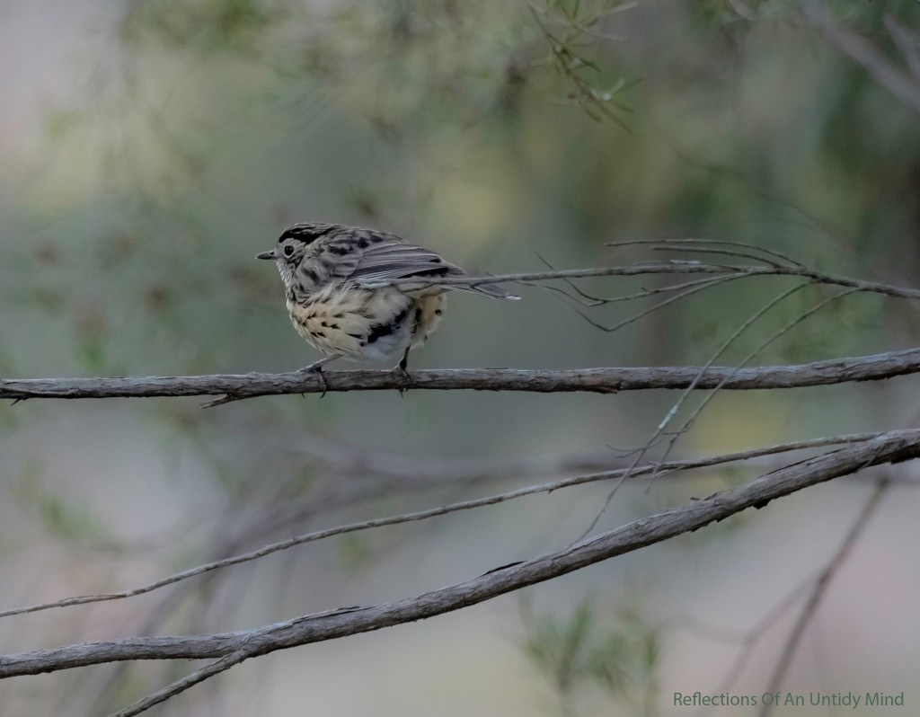 Here are some busy little birds – firstly, a busy photo of a silvereye getting a dusting of wattle pollen, and secondly, a speckled warbler in a more serene green. We also have a front and back view as an added contrast.