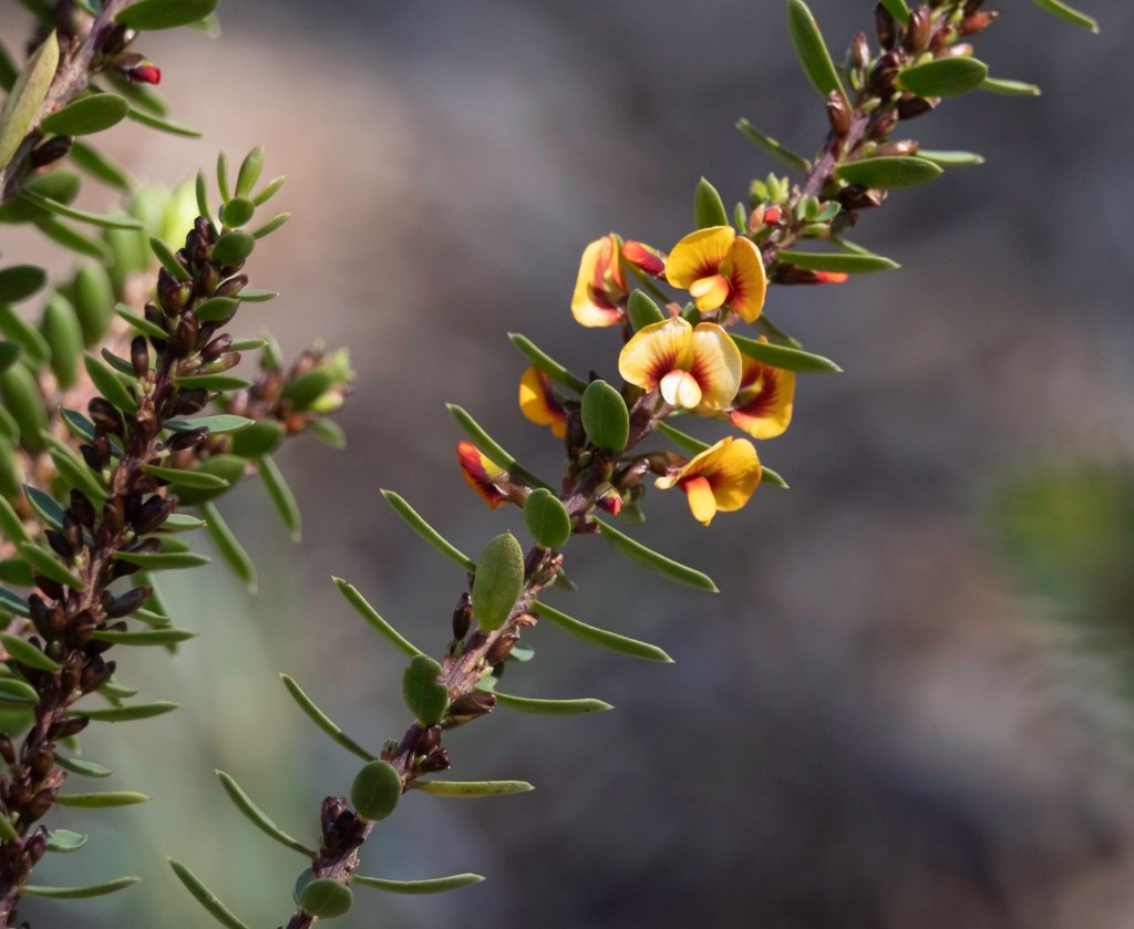 Next we have the egg and bacon plant (Eutaxia obovata) and tucked in along side it is Craspedia variabilis once again. The former is a West Australian shrub but doing quite well in sunny (just joking) Canberra on the opposite side of the country. The colours are best described as garish but the insects like them.