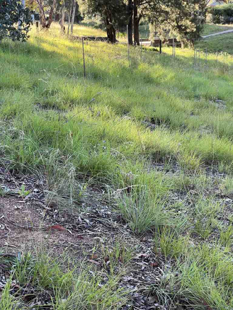 Native grasses re-establishing under eucalypts. We have our eye on the African Love Grass beyond the conservation bollard. It will take time to get there but get there, we will.