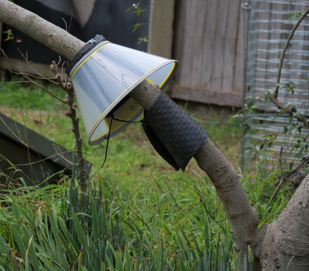 Our fig tree fruited prolifically this year, but it seemed none but the rodents would enjoy the fruit. We tried collaring the tree with an Elizabethan dog collar to prevent the rodents ascent. It worked.