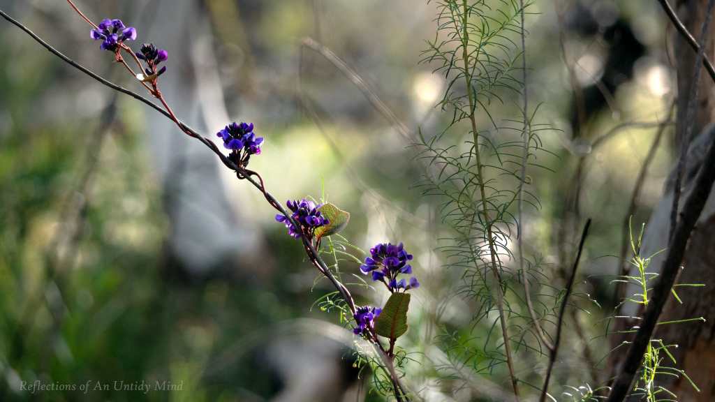 I think the plant in the next photo is Hardenbergia violacae. It was so lovely and delicate, glinting red where the sun fell on the twining stems. We saw many plants in bud, so if you happen to be in Canberra (Australia) over the next month, the floral displays at the ANBG are sure to be even more spectacular and well worth a visit. A tip – I much prefer the somewhat dishevelled, natural gardens up the hill rather than the more manicured, curated gardens that are on the lower levels.