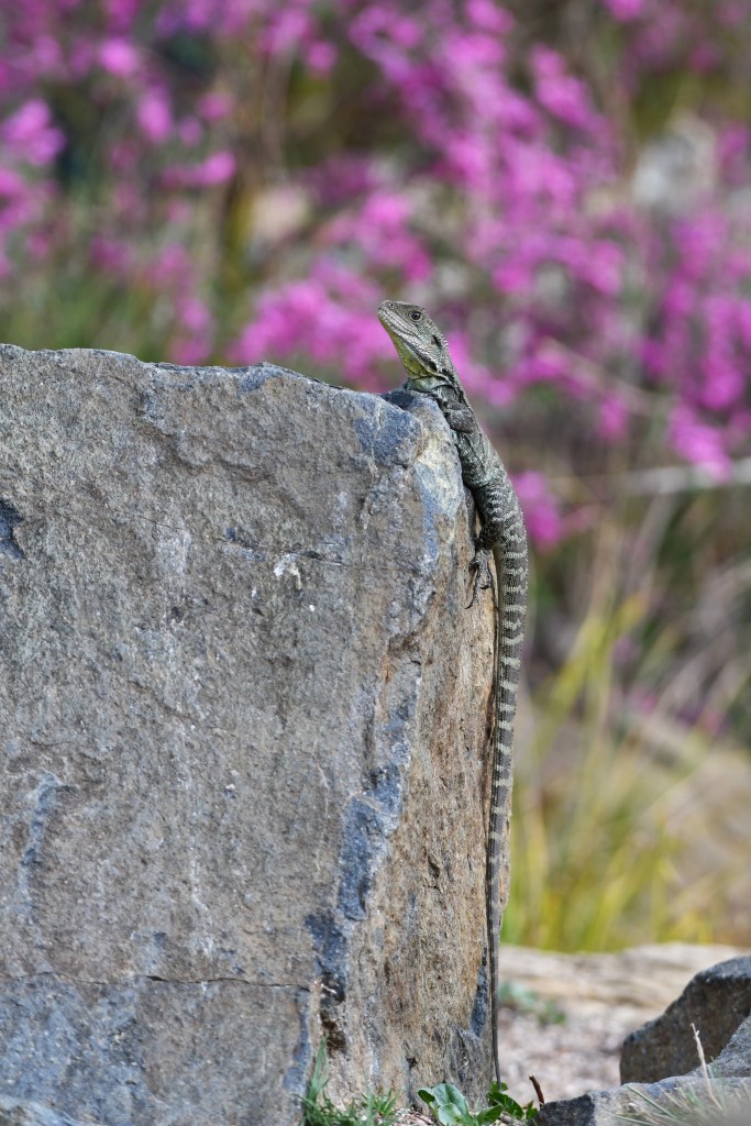 About The Photos I dragged my True Love to the Botanic Gardens one weekend. He is still recovering from his Achilles heel tendon tear, so he shuffled along with his camera. He took the photos of the bearded dragon with the purple flowers in the background, the bright yellow “Twistie” like flowers (Twisties are a type of cheese curl, corn-based snack food product), and in fading light, the shenanigans of a pair of gang-gang cockatoos. I took all the other photos.